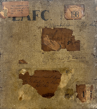 Rückseite des Winterbildchen mir einigen alten Auktions-Etiketen und Beschriftungen.