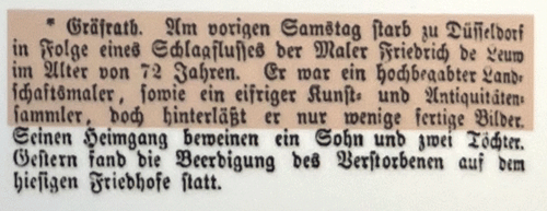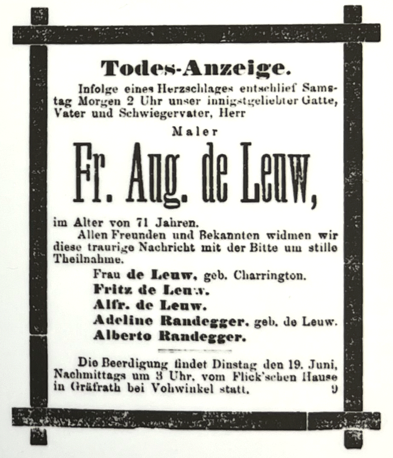 So sah die Todesanzeige von Friedrich August de Leuw aus. Demnach hatte de Leuw einen Herzschlag und entschlief in aller Frühe am Samstag Morgen den 16.6.1888 um 2 Uhr.